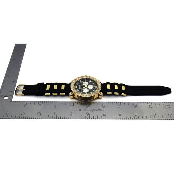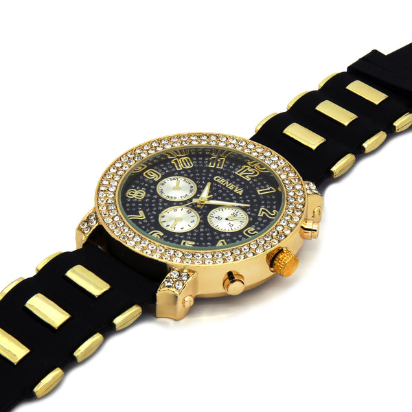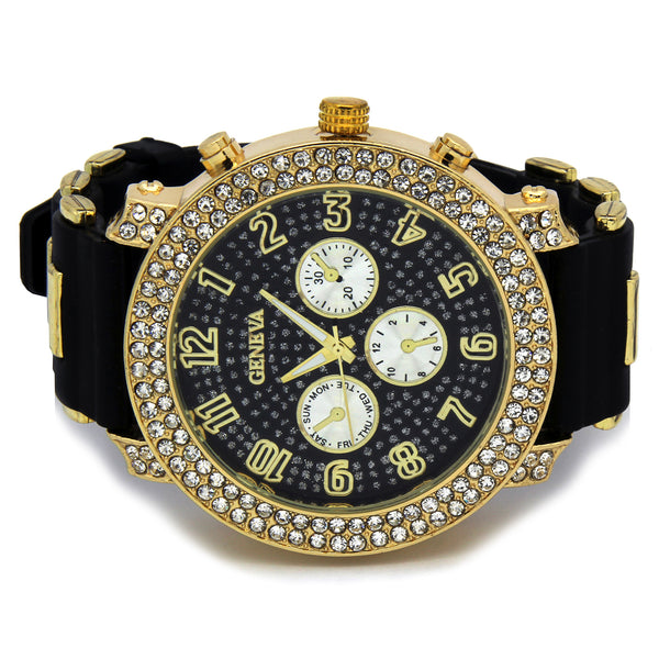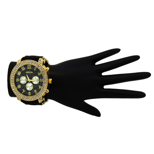 Geneva Bling Fully Iced Silicone Band Wrist Watch Big Size Face Diameter: 52mm Thickness: 12mm Stylish and trendy with scratch resistant mineral glass Bling Iced out bezel filled with lavish genuine Czech...