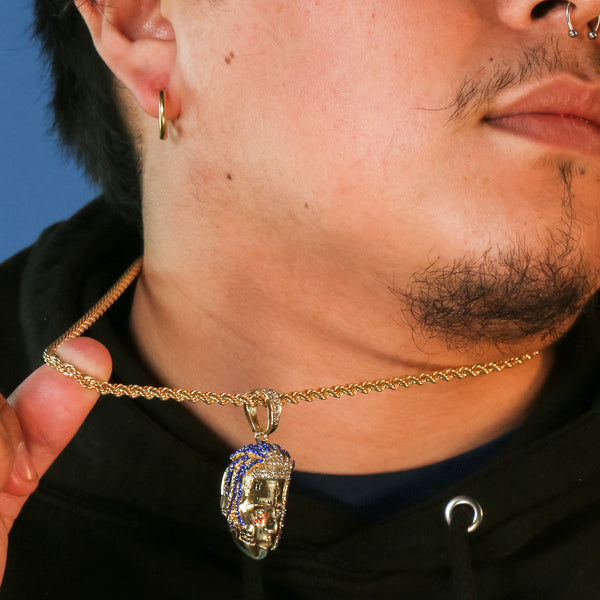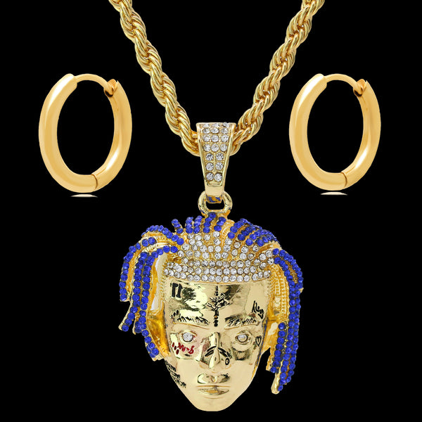 This is 14k Gold Plated Face Exquisite Tentacion Pendant hanging from a 24" Rope chain with a beautiful set of Gold Stainless Steel Thin EarringsĀ . Each and every stone on...