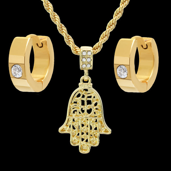 Gold Plated Hamsa Pendant 24" Rope Chain/Stainless Steel Huggie Hoop Cz Earrings 2pc Set
