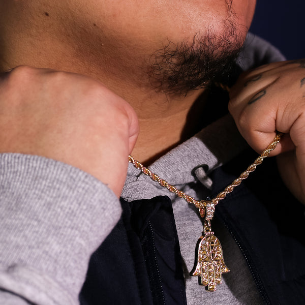 This is 14k Gold Plated Hamsa Pendant hanging from a 24" Rope chain with a beautiful set of Gold Stainless Steel Cz EarringsĀ . Each and every stone on this pendant...