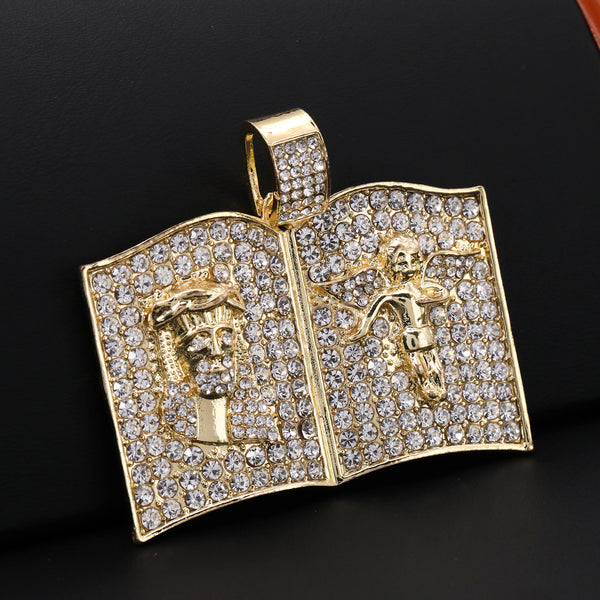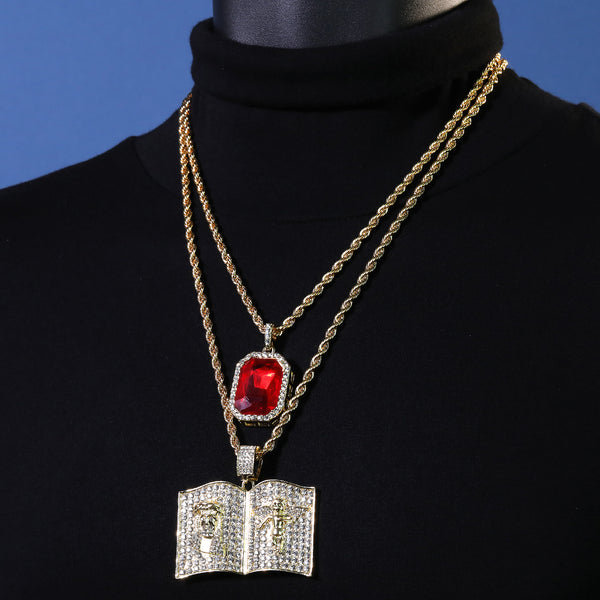 Gold Plated Red Stone & Holy Bible Jesus Pendant Cubic-Zirconia Rope Chain
