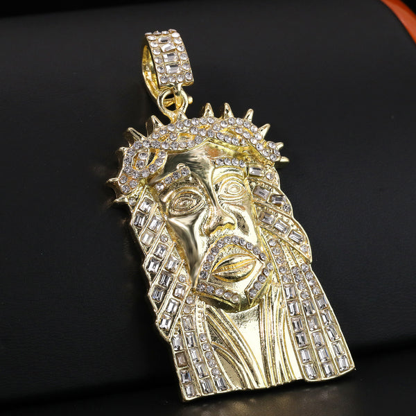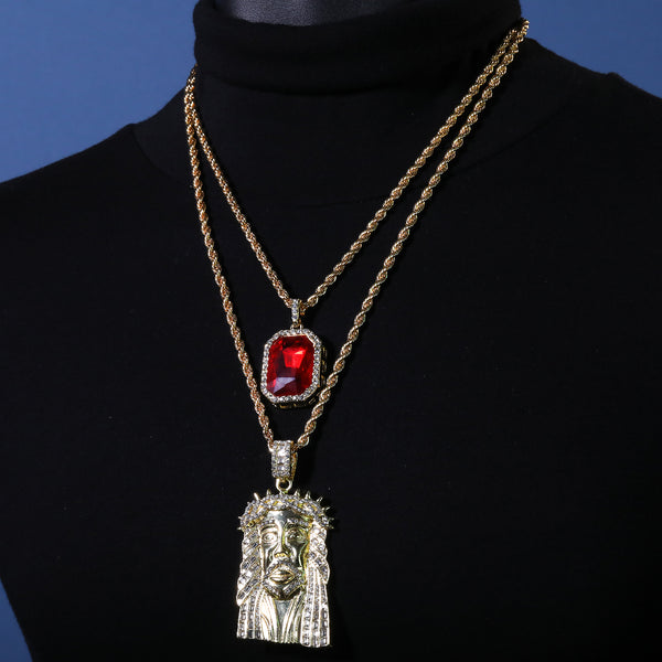 Gold Plated Red Stone & Thorn Crown Jesus Face Pendant Cubic-Zirconia Rope Chain