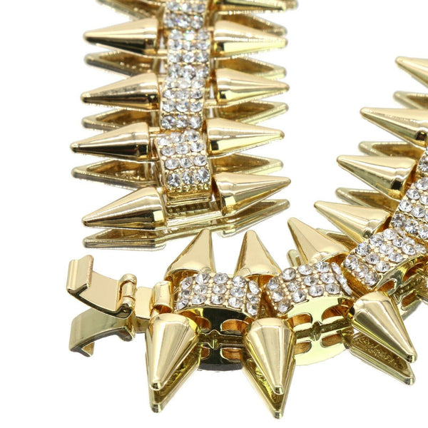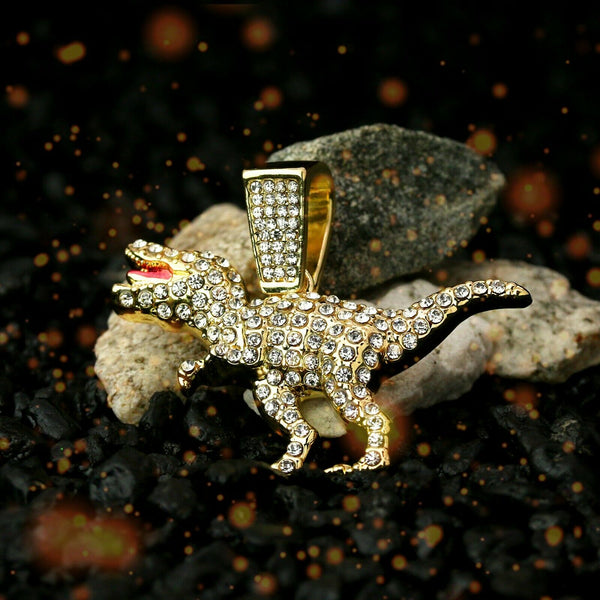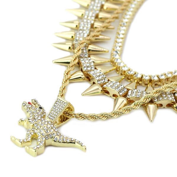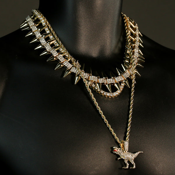 High Fashion Gold Plated AAA Spiky Chain Tennis Chains & Cz Dinosaur Roar T-Rex Pendant