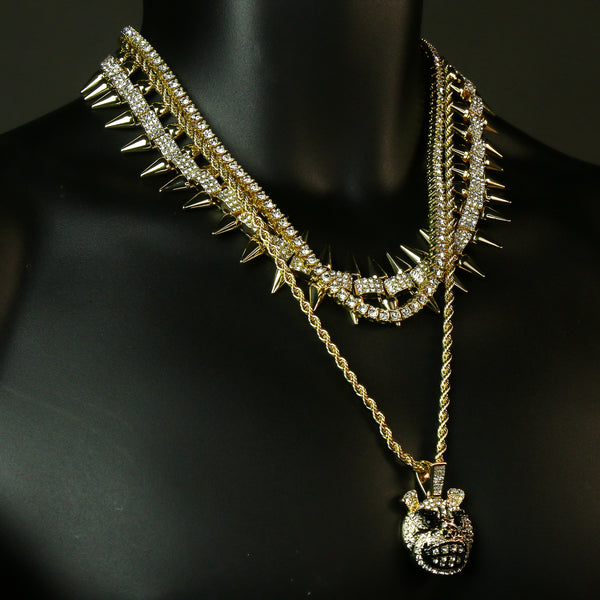 High Fashion Gold Plated AAA Spiky Tennis Chains & Cz Mad Dog Face Head Pendant