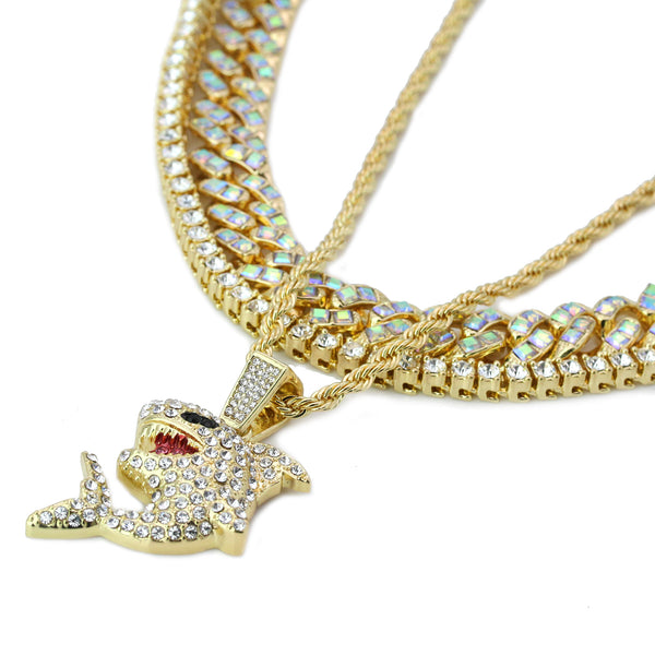 High Fashion Gold Plated AB 2 Row Cuban Tennis Chains & Cz Shark Flooded Pendant