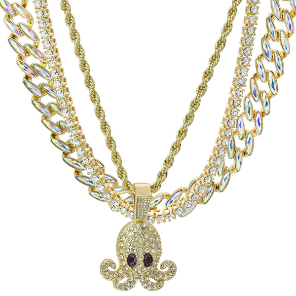 High Fashion Gold Plated AB Cuban Tennis Chains & Cz Purple Eye Squid Pendant
