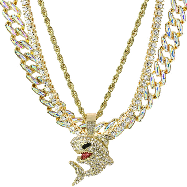 High Fashion Gold Plated AB Cuban Tennis Chains & Fully Cz Shark Flooded Pendant
