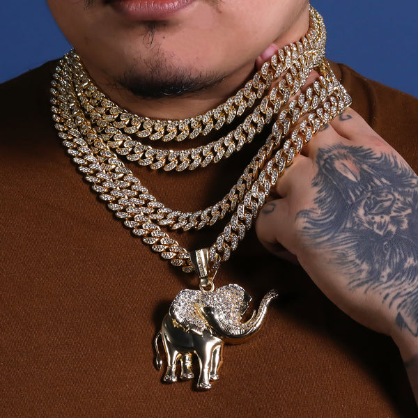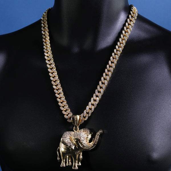 Hip Hop Fully Iced Large Gold Plated Elephant Pendant Cuban Chain 18 - 24"