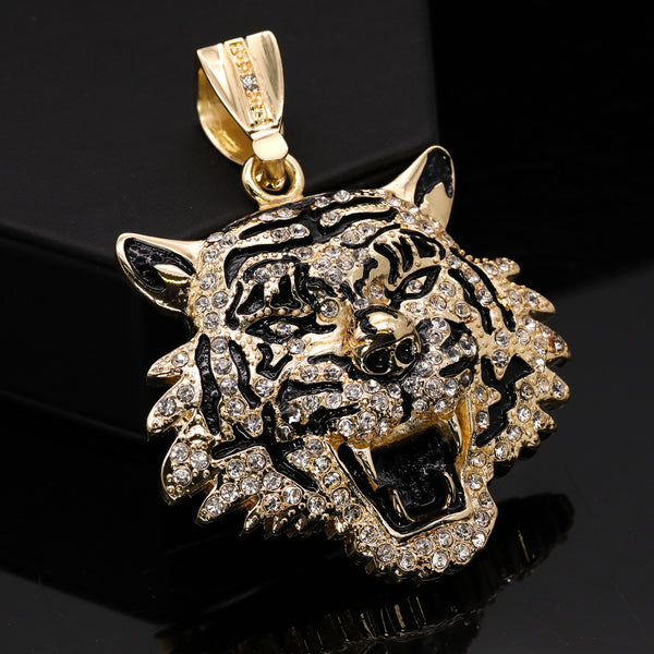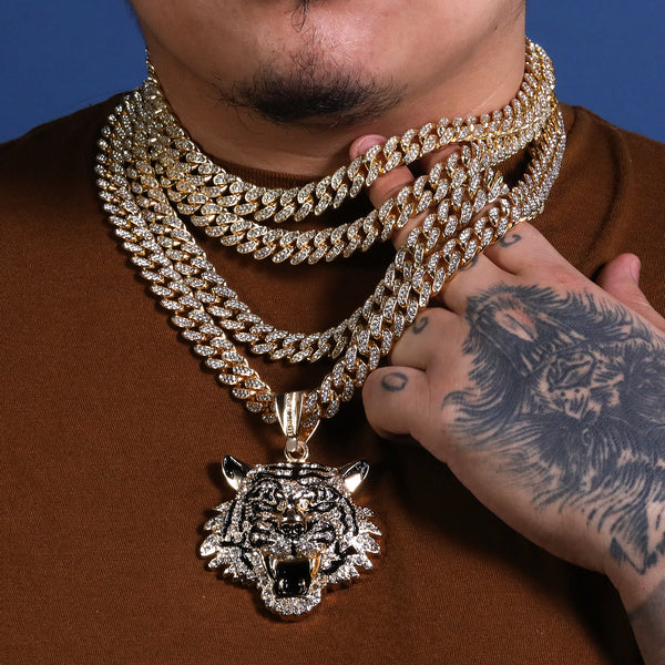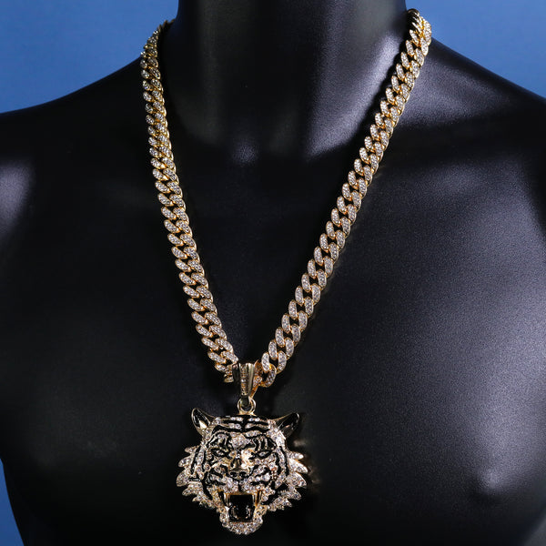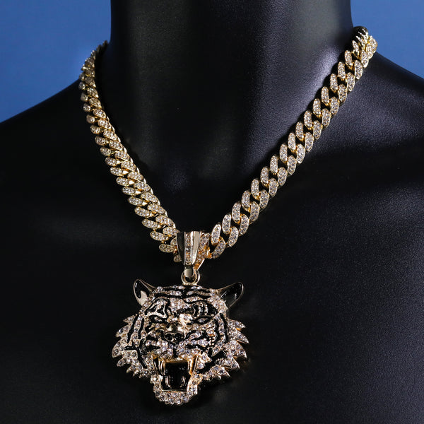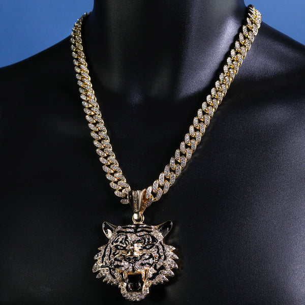 Hip Hop Fully Iced Large Gold Plated Tiger Face Pendant Cuban Chain 18 - 24"