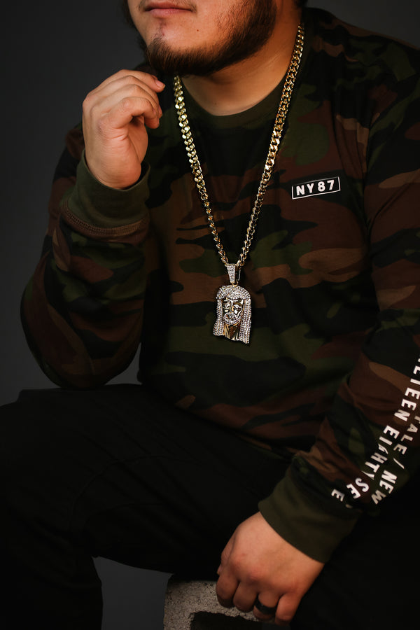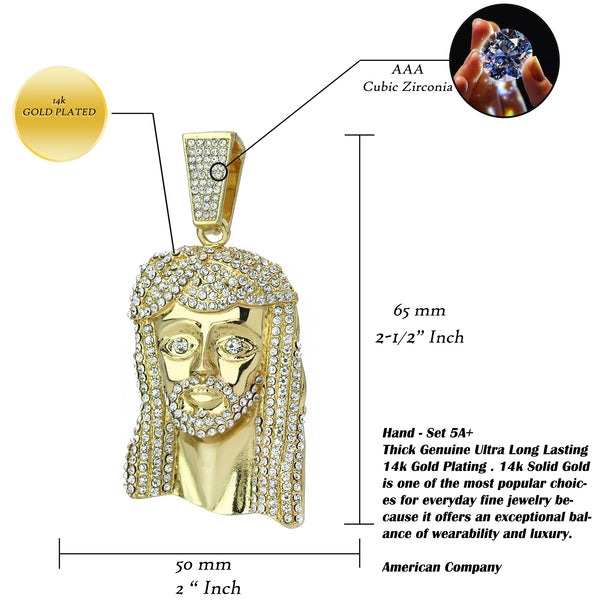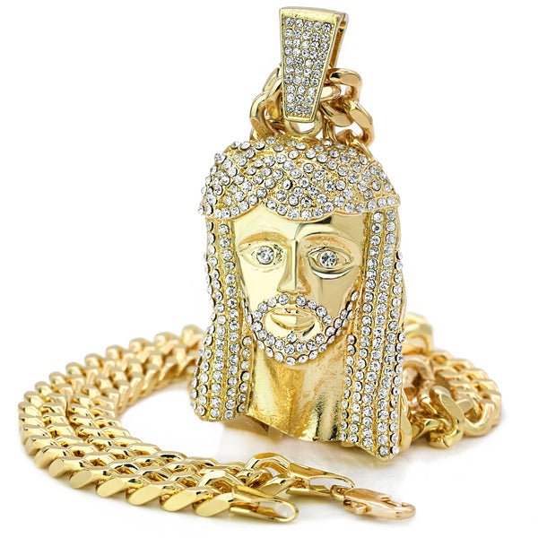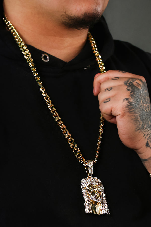 Discover timeless luxury with our Iced Jesus Peace Face Pendant paired with a 30" Miami Cuban Link Chain. The 3" x 2" gold pendant, encrusted with clear CZ stones, exudes...