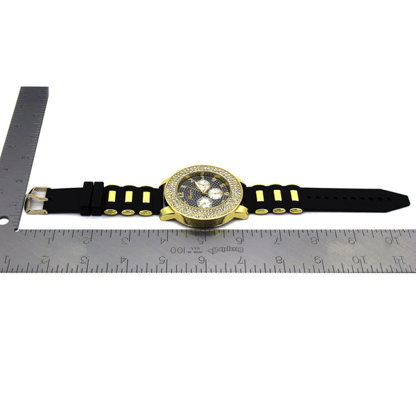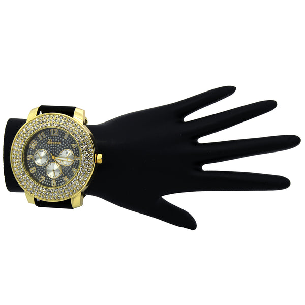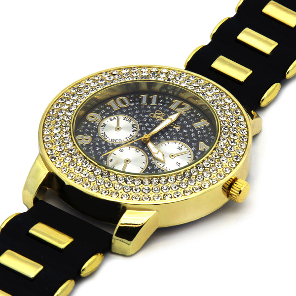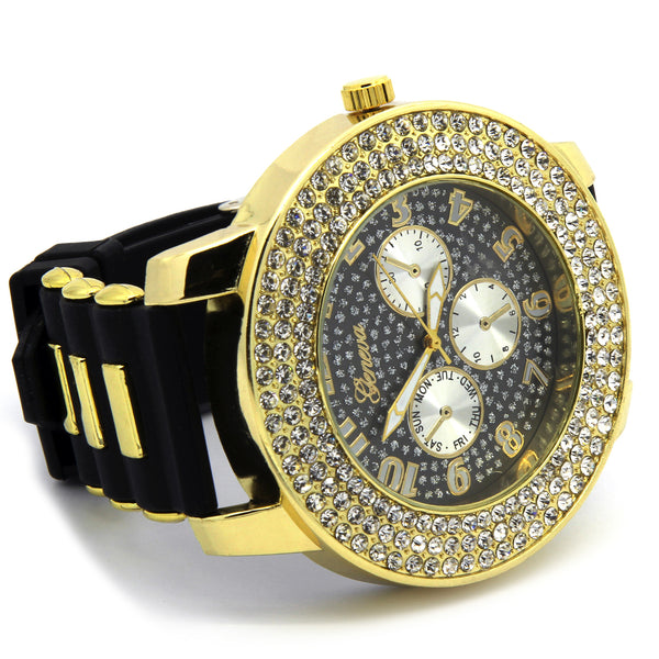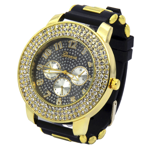 Geneva Bling Fully Iced Silicone Band Wrist Watch Big Size Face Diameter: 55mm Thickness: 10mm Stylish and trendy with scratch resistant mineral glass Bling Iced out bezel filled with lavish genuine Czech...
