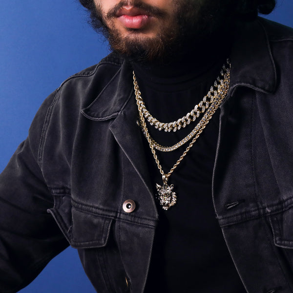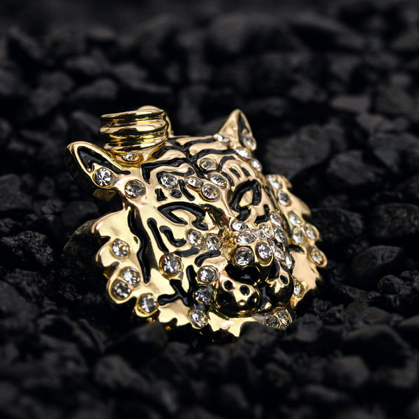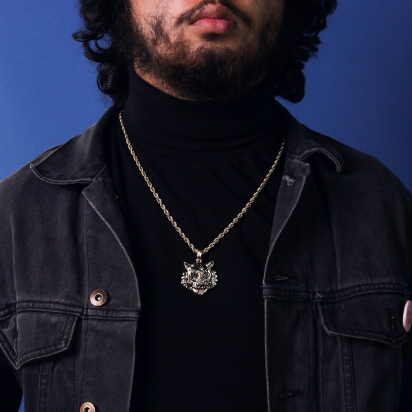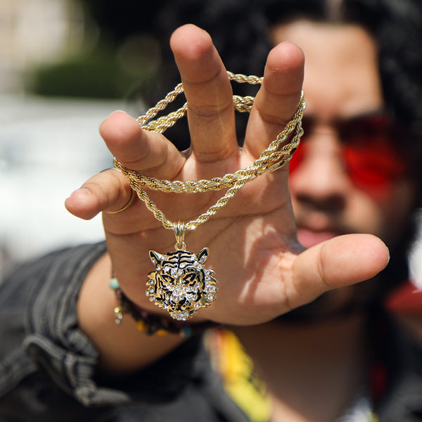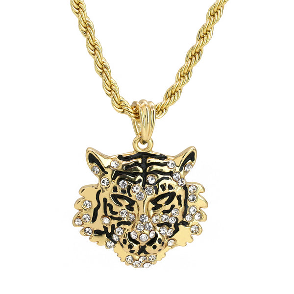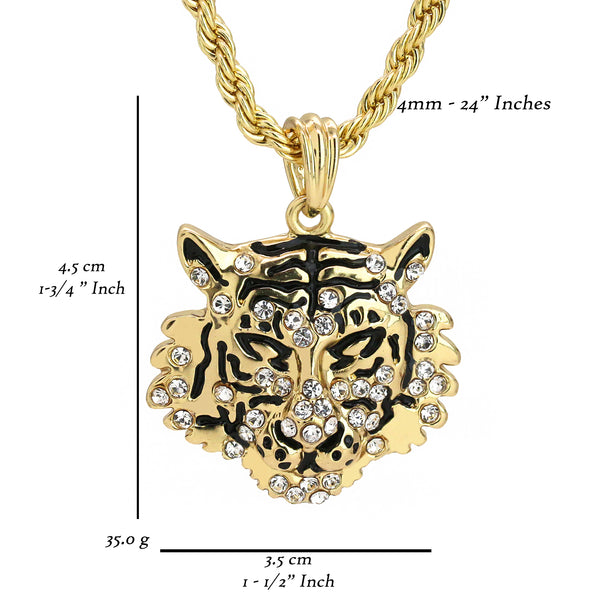 Iced Tiger Face Pendant 18K 24" Rope Chain Hip Hop Jewelry