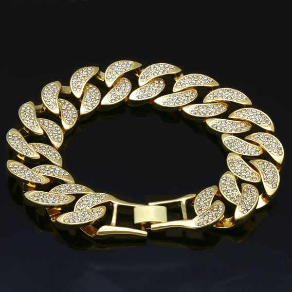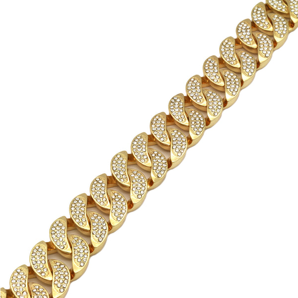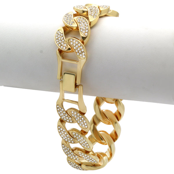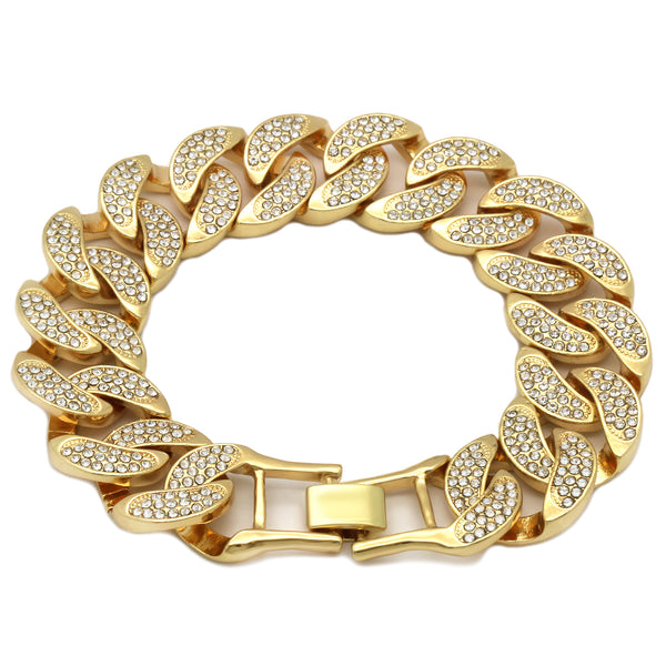 20 mm x 8.5"Elegant Cuban Real Gold Filled FULLY Iced Out Bracelet. Tarnishing Free "Life Time Guarantee" on Air Condition. High-impact 14k Gold Plating over Brass. Lustrous Cz Finish in front...
