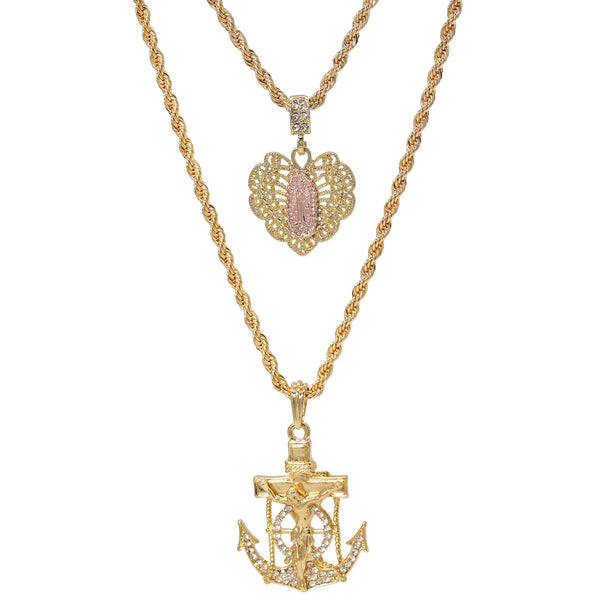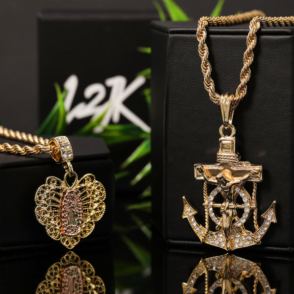 Hip Hop Bling 14K Gold Filled Necklace Pendant 14K Gold Filled Iced Out Jesus Anchor & Catholic Heart Guadalupe Pendants with 4mm 24"/30" Rope Chain Gold Filled Over Brass Makes...