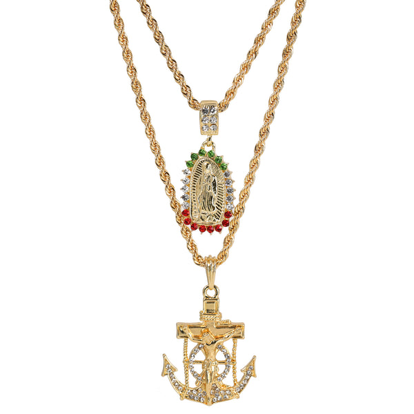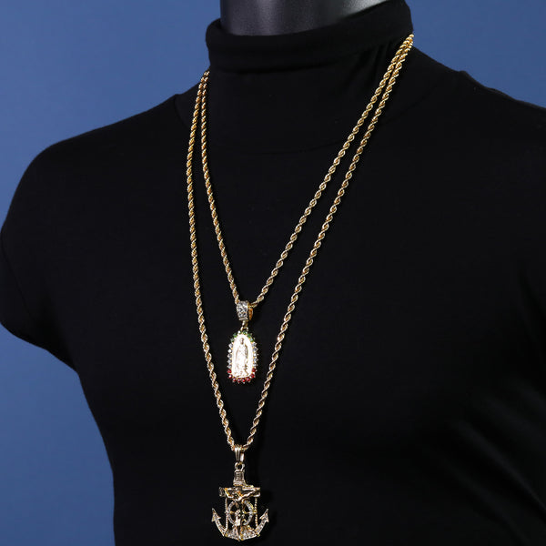 Jesus Anchor & Catholic Oval Spike Guadalupe Pendant Gold Plated 24 30 Rope Chain Cubic-Zirconia