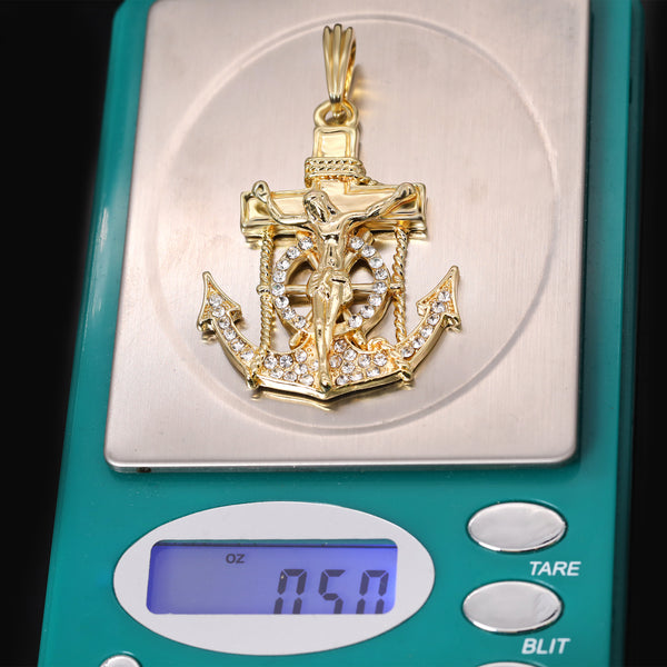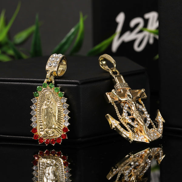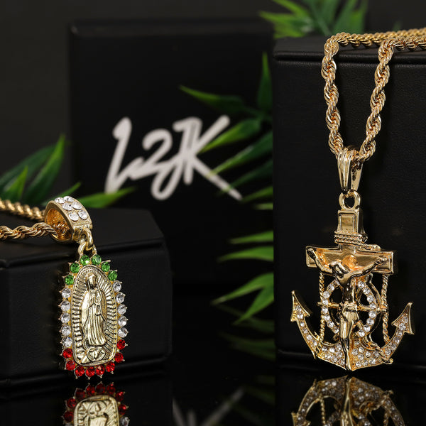 Hip Hop Bling 14K Gold Filled Necklace Pendant 14K Gold Filled Iced Out Jesus Anchor & Catholic Oval Spike Guadalupe Pendants with 4mm 24"/30" Rope Chain Gold Filled Over Brass...