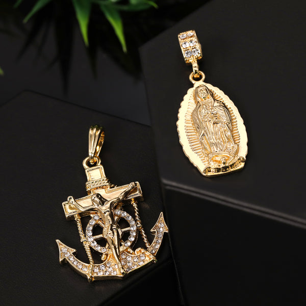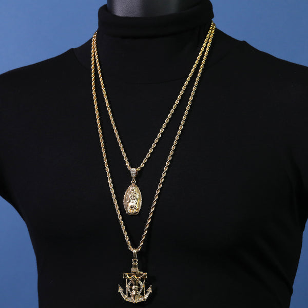 Jesus Anchor & Catholic Oval Wavy Mary Guadalupe Pendant Gold Plated 24, 30 Rope Chain Cubic-Zirconia