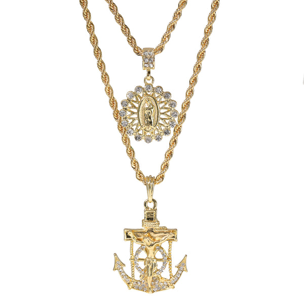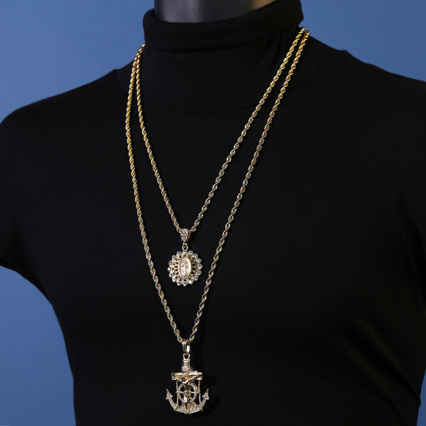 Jesus Anchor & Catholic Round Line Mary Pendant Gold Plated 24 30 Rope Chain Cubic-Zirconia