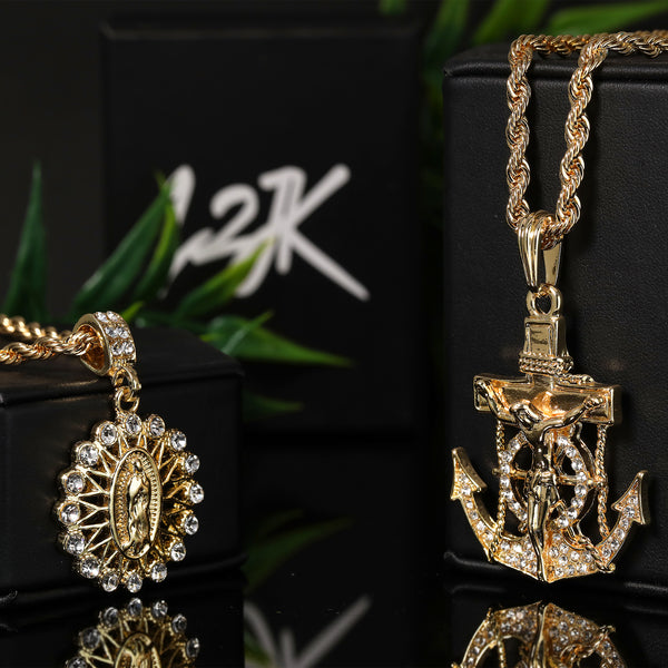 Hip Hop Bling 14K Gold Filled Necklace Pendant 14K Gold Filled Iced Out Jesus Anchor & Catholic Round Line Guadalupe Pendants with 4mm 24"/30" Cuban Chain Gold Filled Over Brass Makes...