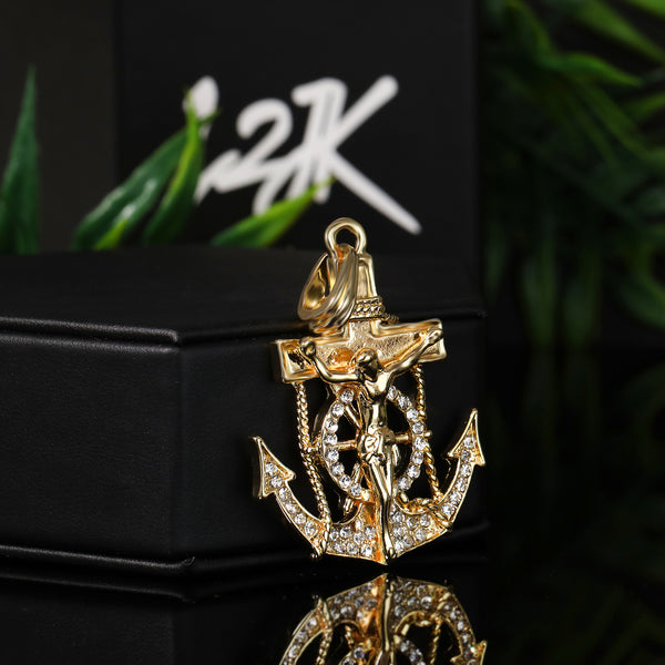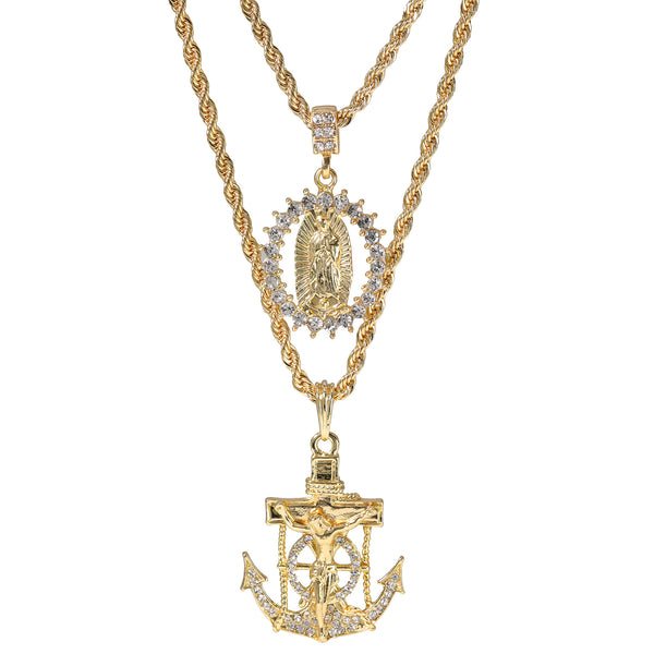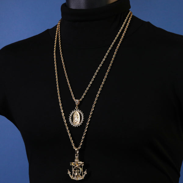 Jesus Anchor & Catholic Round Spike Mary Pendant Gold Plated 24, 30 Rope Chain Cubic-Zirconia