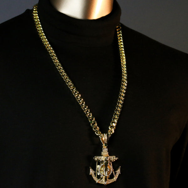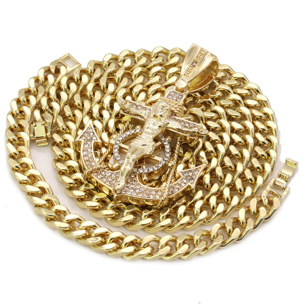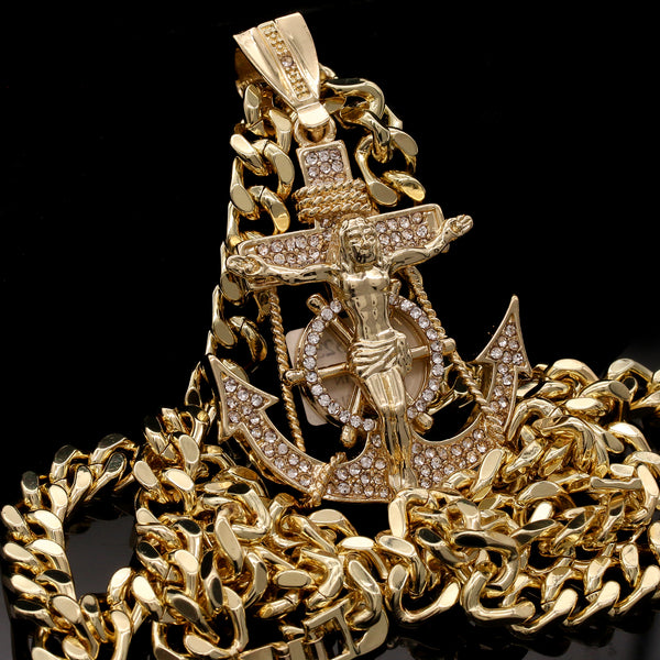 Men's Gold Plated Hip-Hop XL Cz Jesus Anchor Cuban 10mm 30 & Bracelet 3pc Set