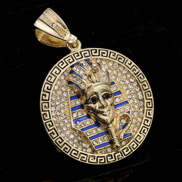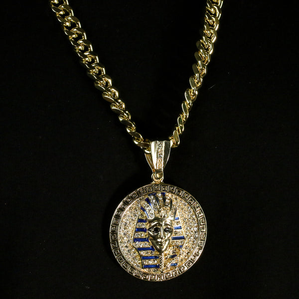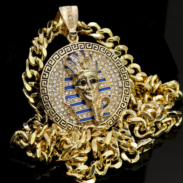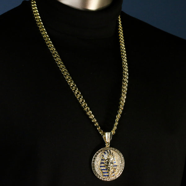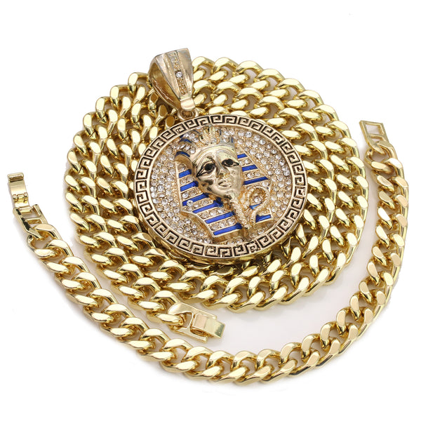 Men's Gold Plated Hip-Hop XL Cz Round Pharaoh Cuban 10mm 30 & Bracelet 3pc Set