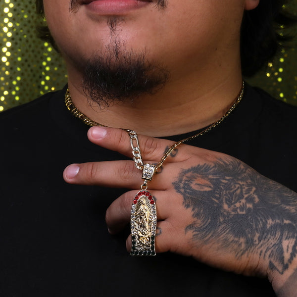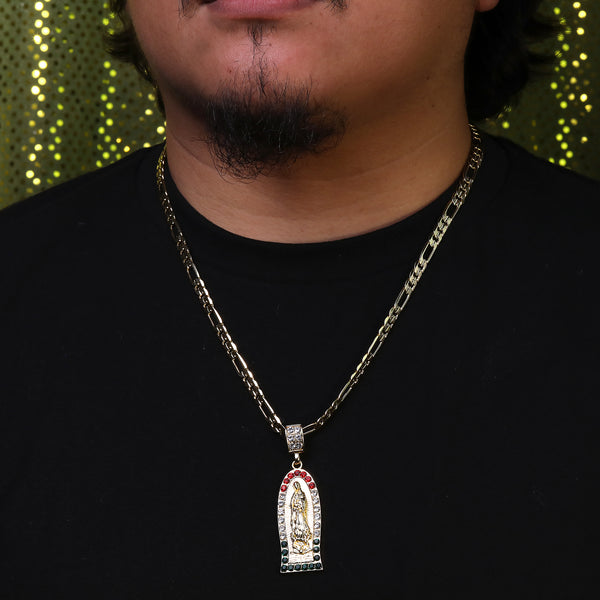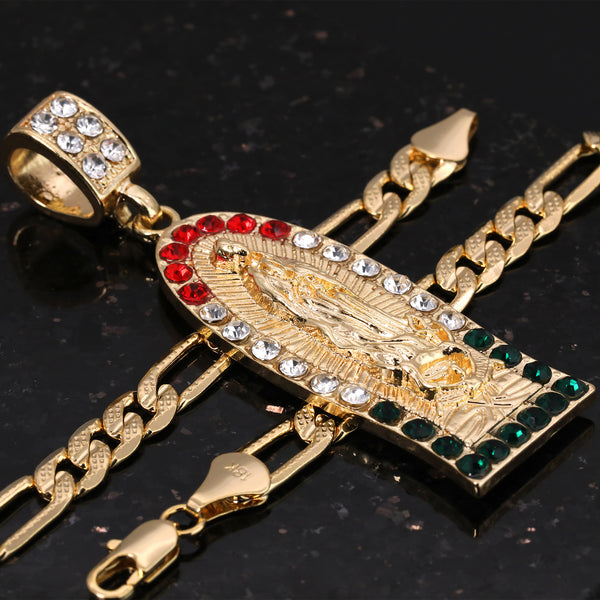 Oval Flat Thin Mexican Guadalupe Pendant Cubic Zirconia Frost Figaro 24" Gold Plated