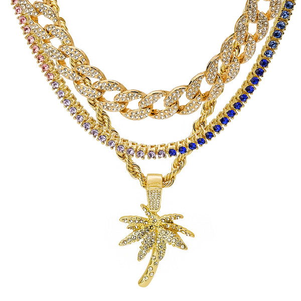 Palm Tree 4 Pcs Set Cuban, Tennis & Rope Chain Bundle Gold PT
