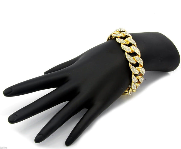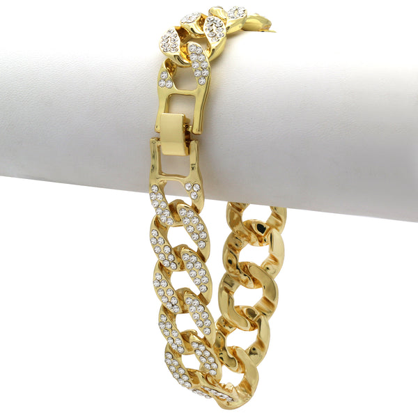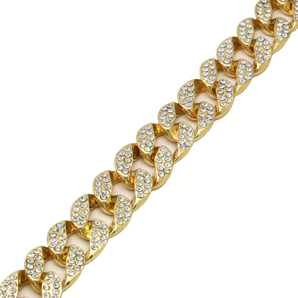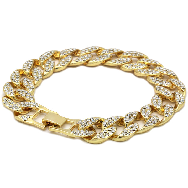 Elegant Cuban Real Gold Filled FULLY Iced Out Bracelet. Tarnishing Free "Life Time Guarantee" on Air Condition. High-impact 14k Gold Plating over Brass. Lustrous Cz Finish in front of every link....