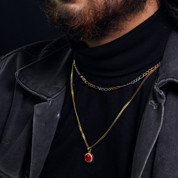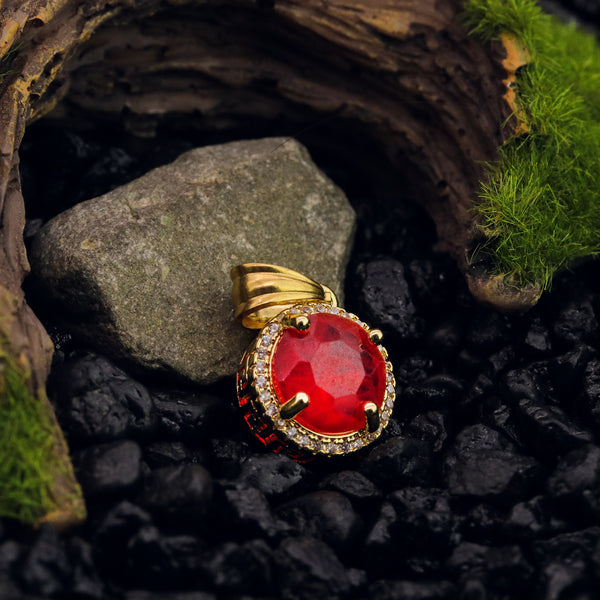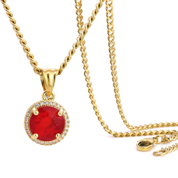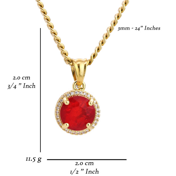 Red Round Ruby Pendant 24" Cuban Chain Hip Hop Style 18k Gold Stainless Steel