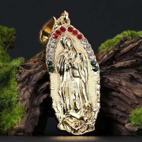 Rugged Oval Mexican Religious Guadalupe Pendant Cubic Zirconia Frost Figaro 24" Gold Plated