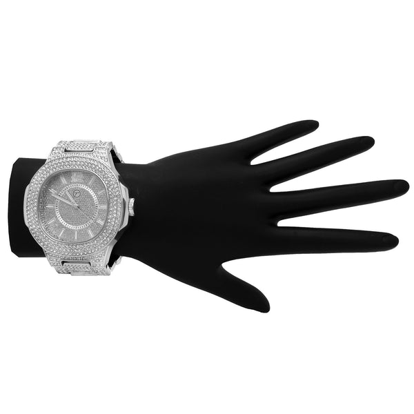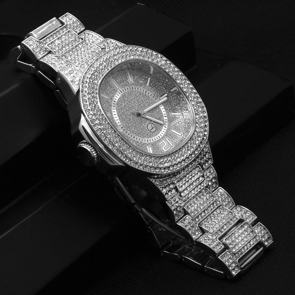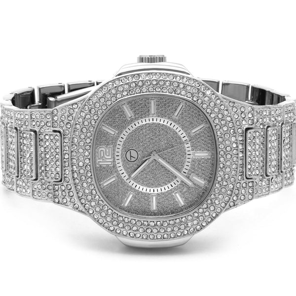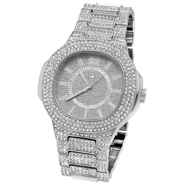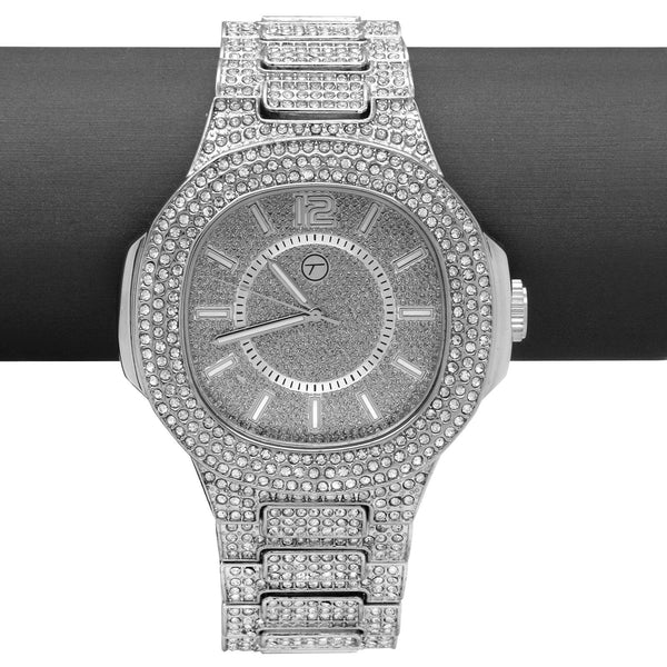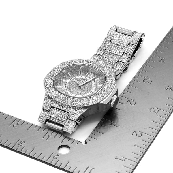 Techno KingĀ Bling Fully Iced Metal Band Wrist Watch Big SizeĀ Face Diameter: 45mm Thickness:10mm Lab Diamond Looking Design Stylish and trendy with scratch resistant mineral glass Bling Iced out bezel and...