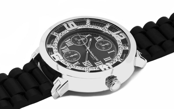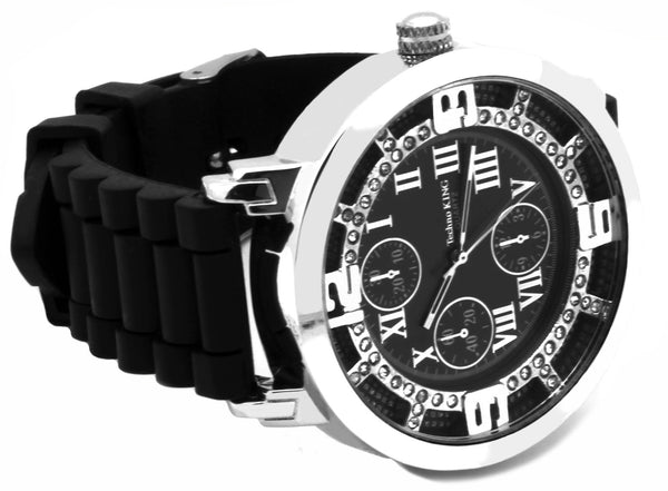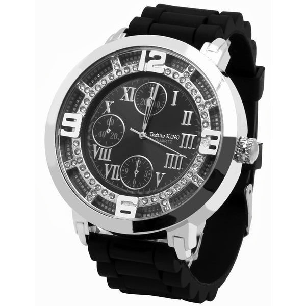 Techno King Bling Fully Iced Silicone Band Wrist Watch Big Size Face Diameter: 50mm Thickness: 10mm Stylish and trendy with scratch resistant mineral glass Bling Iced out bezel filled with lavish genuine Czech...