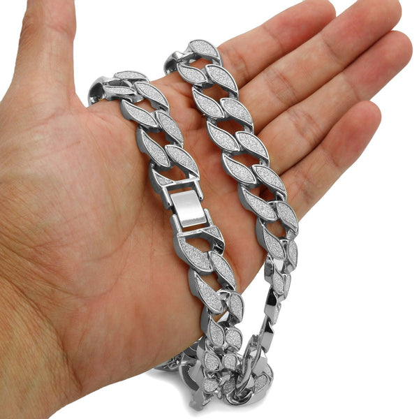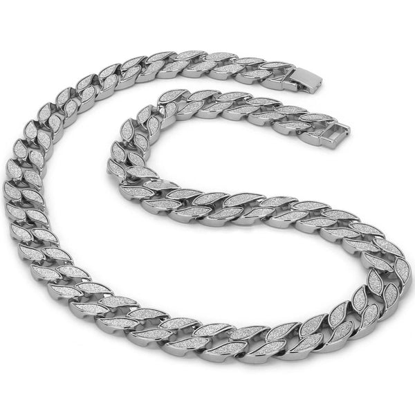 The strong, tightly-spaced links of our newest 18 mm Stardust Miami Cuban Link Necklace makes for a Chunky but still Sleek and Shiny design. The Sandblast Bling makes it Look...