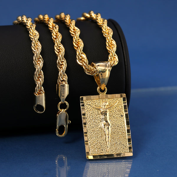 Square Jesus Pendant S4 Rope Chain 14k Gold Plated