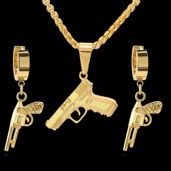 SST Gold Pistol Gun 24" Cuban Chain/Huggie Hoop Revolver Gun Dangle Earring 2pc Set