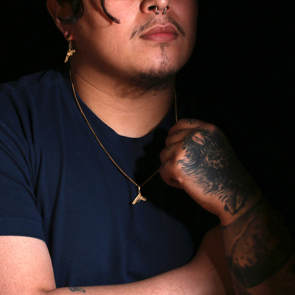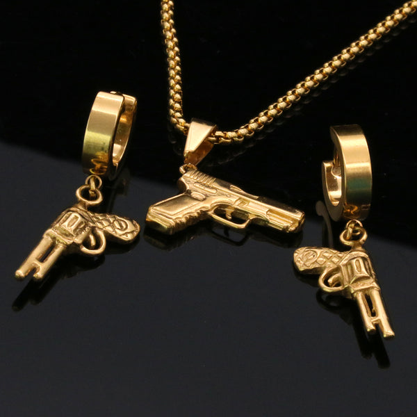 This is Gold Stainless Steel Pistol Gun Pendant hanging from a 24" Box chain with a beautiful set of Gold Stainless Steel Cz Revolver Gun EarringsĀ . Each and every stone...