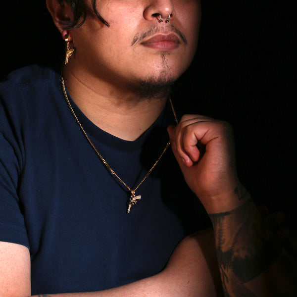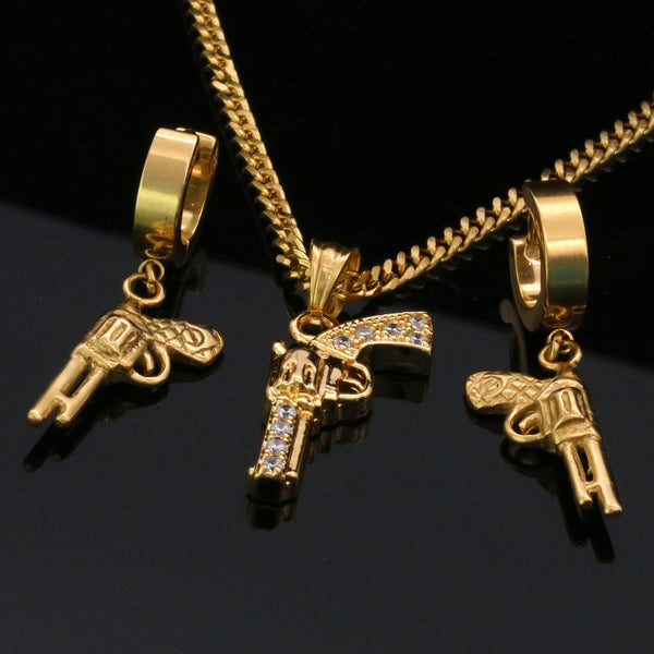 This is Gold Stainless Steel Cz Revolver Pendant hanging from a 24" Cuban chain with a beautiful set of Gold Stainless Steel Cz Revolver Gun EarringsĀ . Each and every stone...