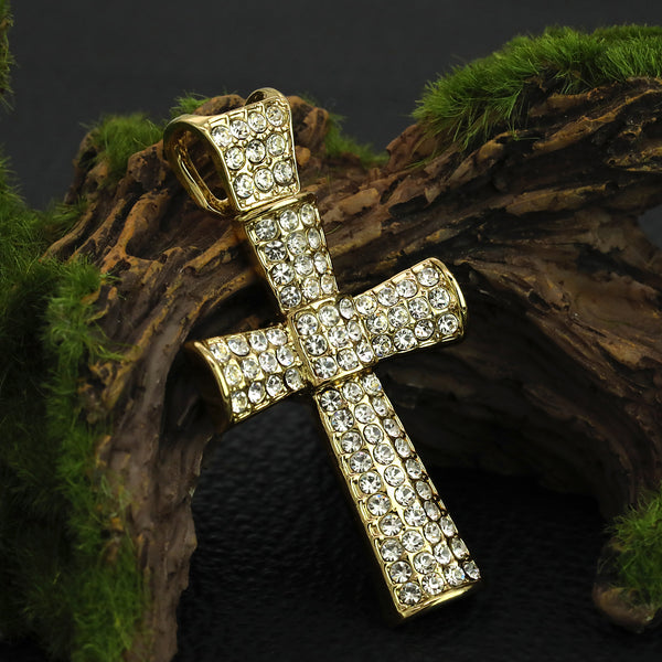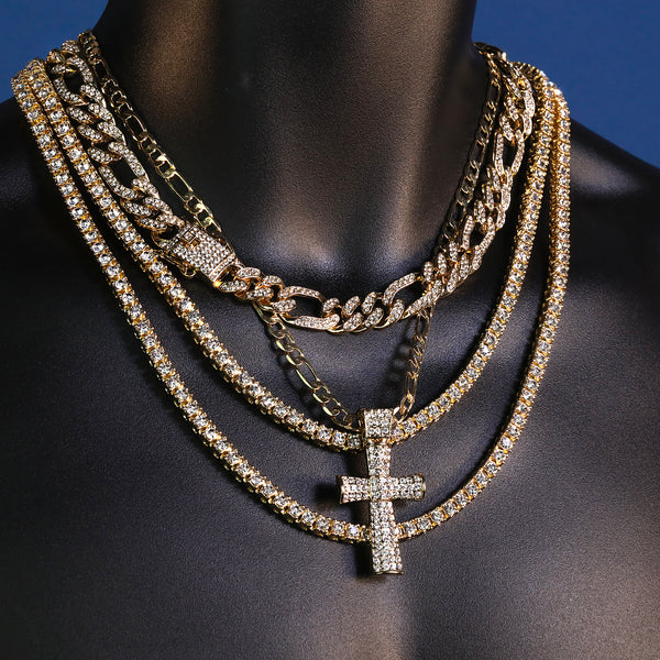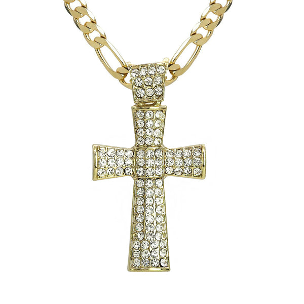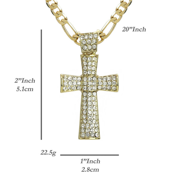 Thick Icy Cross Pendant 20" Figaro Chain Hip Hop Style 18k Gold Plated