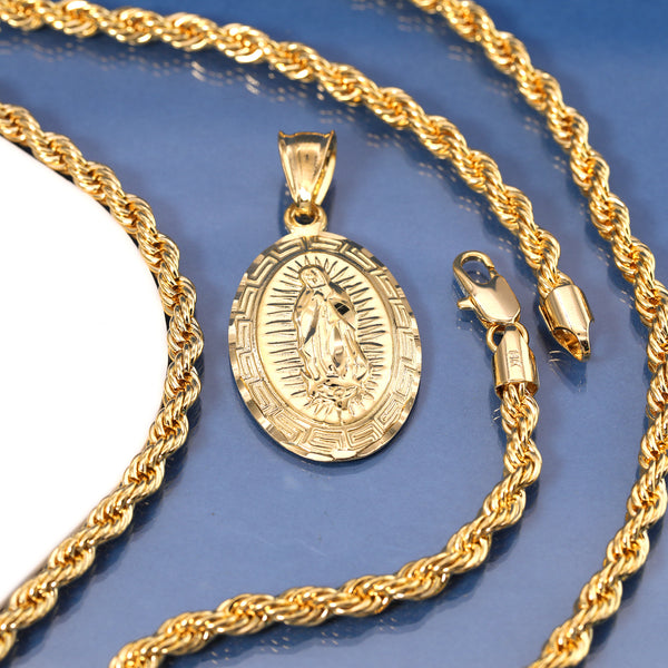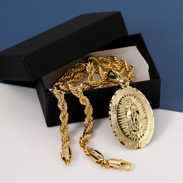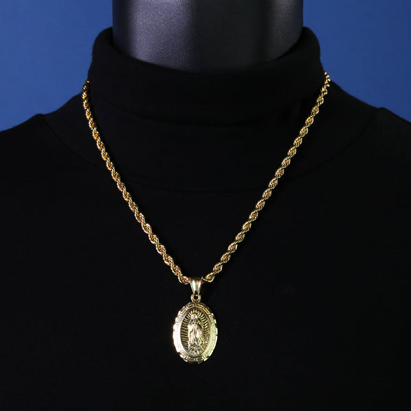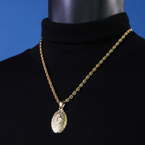 Thick Oval Mary Pendant Rope Chain 14k Gold Plated