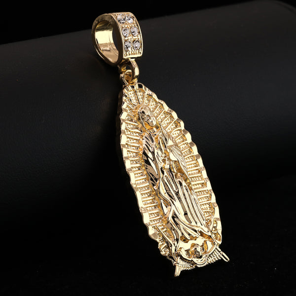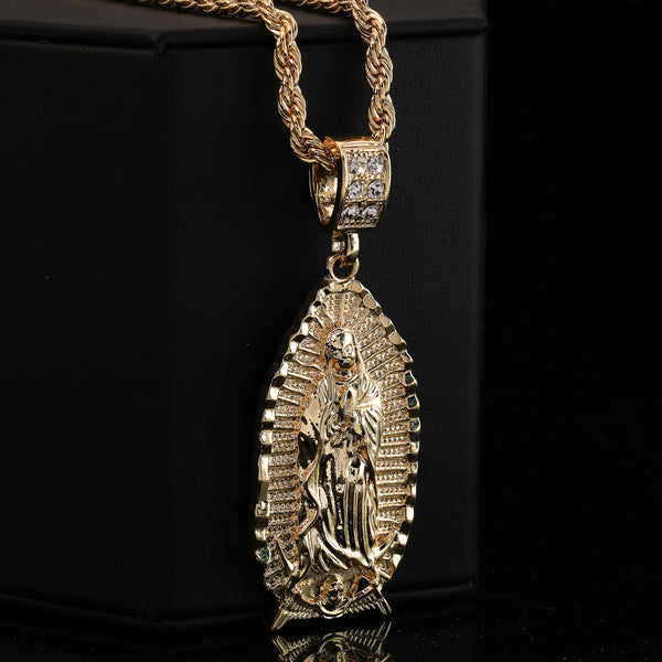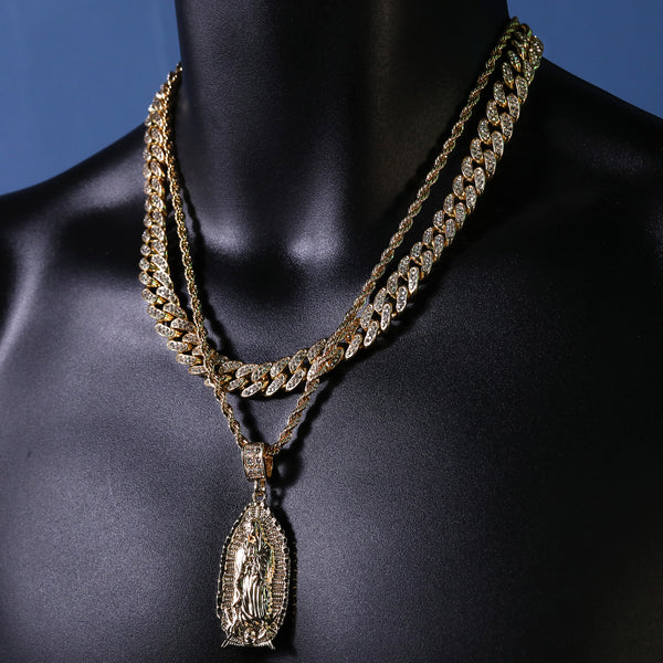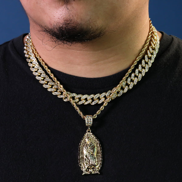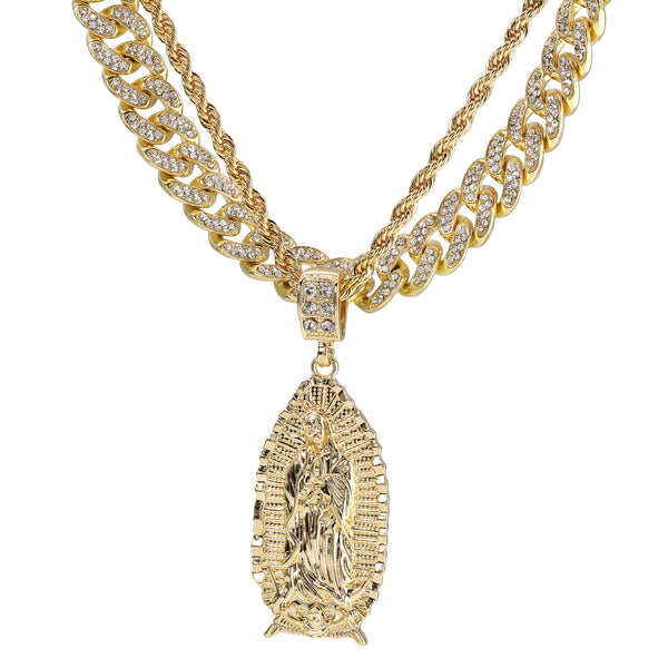 Wide Oval Guadalupe Pendant 14k Gold PT 20" Cuban & Rope Chain