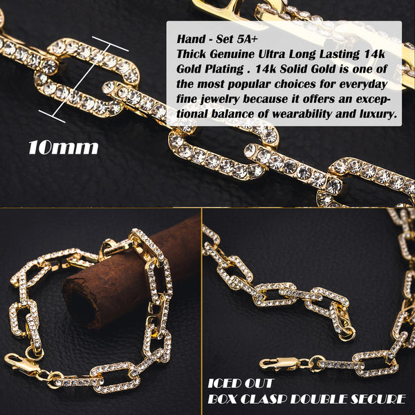 Elegant Fully ICED OUT Bracelet Makes You Shine Perfect. High-impact 14k Gold Plating over Brass Large width of 10 mm / 9" Inches medium sized Bracelet Carefully interlocked links that create a...