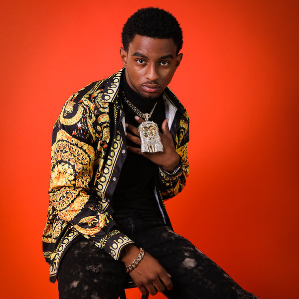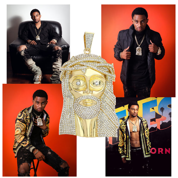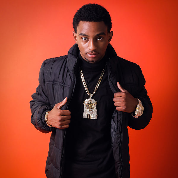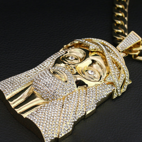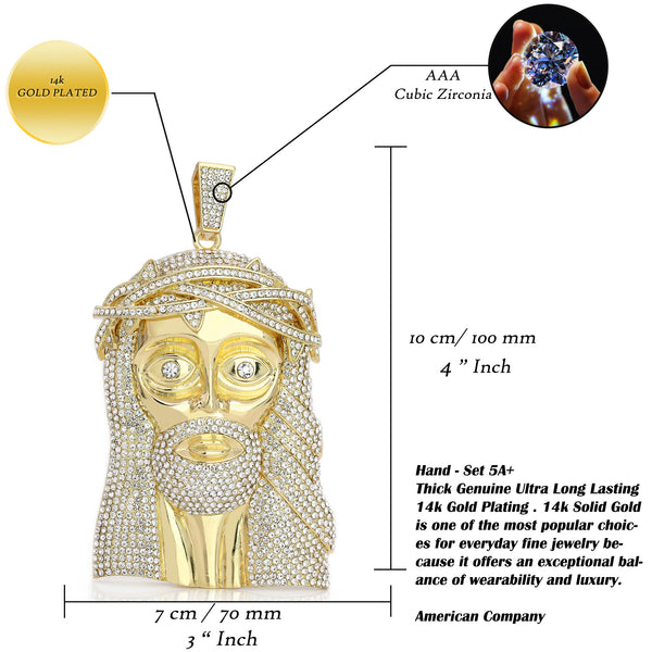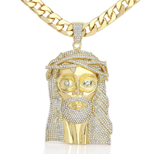 Make a powerful statement with this XL Thorn Crown Jesus Face Iced Pendant paired with a bold 14mm Cuban chain. Measuring 2.5" x 4" and weighing approximately 180g, this stunning...